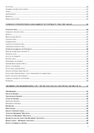 Covers topics for entire semester * Introduction to Corporations Law; the Characteristics of Corporations * Incorporation and the Corporate Veil * Pre-incorporation contracts, Promoters, and Directors * Company Constitutions; Liability in Contract * Membership and Shareholding * Securities Markets * Directors' Duties - Best Interest and Proper Purpose * Directors' Duties - Conflicts of Interests, Care and Diligence * Consequences of Breaches of Duties * Companies' legal rights against others - Directors, Auditors and Third Parties * Members' Rights and Remedies * Insolvency Includes lecture notes, case summaries and sections of the textbook