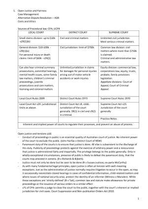 This set of notes is for the Civil Procedure part of this subject - does not include Criminal Procedure. Topics covered by Tanya and James (Lecturer and tutor): -Open Justice and Fairness -Case Management -Orders -Pleadings -Privilege -ADR Page references are to the prescribed textbook, Civil Procedure in New South Wales (3rd ed) by Vikovitch et al. I used this set of notes for the open-book final exam and scored 76% for the finals.