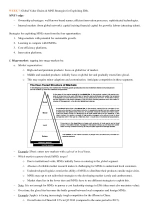 These notes are a complete summary of the IBUS3109 content. The notes include all definitions, graphs, frameworks and theory that is required for the mid-sem exam, final exam, and group assessment. Week 1. Introduction. Week 2. Opportunities in EMs. Week 3. Challenges in EMs. Week 4. Institutional Voids in EMs. Week 5. Strategies for Responding to Institutional Voids. Week 6. Lessons from Business Groups. Week 7. Global Value Chains. Week 8. Strategies for Managing Risks in EMs. Week 9. Catch-Up by Latecomer Firms. Week 10. Internationalisation by EMs. Week 11. Corporate Structures in China/India. Week 12. Bottom of the Pyramid Strategy. Week 13. Innovation in EMs.