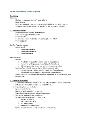These are concise and comprehensive notes which can help you achieve an HD in FINS1612. Topics covered: 1. Introduction to the Financial System 2. The Banking System 3. Equity Markets (1): The Stock Exchange 4. Equity Markets (2): Issuing Equity 5. Equity Markets (3): Investors in the Share Market 6. Debt Markets (1): Short term debt 7. Debt Markets (2): Medium and long term debt 8. Foreign Exchange Rates 9. Interest Rate Determination 10. Future and Forward Rate Agreements 11. Options 12. Interest rate Swaps