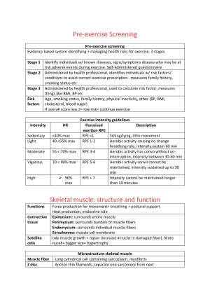 Notes from Lectureres Kate Pumper, Joe Northley, Ben Rattray. Notes contain information on every subject covered in Physiology 1 from pre-screening, acclimatisation, nervous systems, heart rate, stroke volumes, energy systems, muscle fibres.