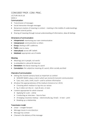 These detailed notes cover all 11 weeks of this unit's teachings, including definitions, explanations & examples for all key terms and concepts. Relevant diagrams & pictures are also included. TOPIC LIST: 1. Intro to prof comms - what is professional communication? - forms of communication 2. Channels & models of communication - dimensions of communication - transmission, Berlo's, Schramm's and Serial's communication models - transacting and context - construction of reality 3. Understanding communication - making sense & noticing thoughts - intra & inter personal communication - attribution theory - persuasion - verbal/ non verbal - types of listening 4. Culture & communication - what is culture? Socialization? Language? Intercultural communication? - high/low context cultures - stereotyping 5. Characteristics of communication (accuracy, clarity, conciseness, etc.) - competency levels - writer's block - word choice - abstract vs concrete - sentence types - pronouns 6. Specific communication forms & their conventions - email, memos, text, social media, posters, billboards etc. - tone of voice - aims/ objectives 7. Research - types of research - evaluating research - reports 8. Oral communication - forms & purposes - persuasive powermap - audiences - content & formats 9. Oral communication - presentations - structure - delivery tips - visuals 10. 'Business' communications - audience & public - public profile/relationships - PR, marketing, advertising - stakeholders - reputation 11. Organisation communication - internal business communication - content strategy - media releases & reactive media