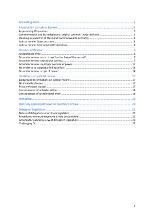 The notes I used in the exam (scored HD). High-level/summarised for ease of use. Covers: * Summary structure of answering questions * Introduction to Judicial Review (approaching JR questions, standing, reviewing Cth and SA decisions) * Grounds of Review (jurisdictional error, error on face of record, procedural fairness, improper use of power etc.) * Limitations on Judicial Review * Statutory Appeals * Delegated Legislation * Remedies