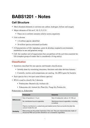 These are the notes that I wrote and used to achieve HD. It covers the topics covered in the course. These are: cells, macromolecules, structure and function of cell membrane, metabolism, photosynthesis, DNA replication, cell division and reproduction, gene expression, polymerase chain reaction, mutation, inheritance and population genetics. Diagrams (from a number of different sources - not just lectures/textbook) and tables have been used where appropriate to supplement the written material. The written notes are clear and well organised so that they are helpful to both learn the material well or for some last minute revision. Save yourself the hassle of writing these up yourself, and improve your marks with these notes.