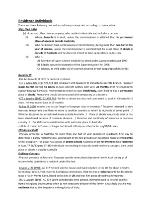 RMIT LAW2453 Notes Hi everyone, these are the taxation notes which I wrote and revised throughout the semester. Furthermore these notes were revised to ensure they'd be suitable for use in exams. Using these notes for the exams I was able to achieve coming in as one of the top 10 students for the semester. It is important to note that these notes do not include taxation of partnership/individuals/companies tax return for a very good reason. In your lecture/tutorial they go through past exam question of these tax returns done and income tax is calculated. I brought my question/answer in to the exam and did it in the exam steps. That is much recommended than writing up notes for them as you can have the same lay out when you get a question on completing a tax return. Also recommend getting some colour sticky notes once these are printed off so it is easier to find certain sections in the notes. These notes have also been passed on to some of my friends who did minimal study throughout the study and received a credit for the subject using my notes in the exam.