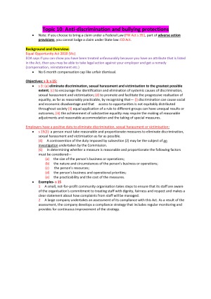 I achieved an 84 for this subject, including a HD on the exam. These notes are perfect for learning the course as they are very detailed. I personally prefer taking in detailed notes into the exam so these were perfect for that and helped me to write detailed answers without too much stress during timed conditions! Covers all topics (1-10). TOPIC 1: OVERVIEW OF EMPLOYMENT REGULATION AND MINIMUM EMPLOYMENT STANDARDS TOPIC 2: EMPLOYEES VERSUS INDEPENDENT CONTRACTORS TOPIC 3: FORMING AN EMPLOYMENT CONTRACT TOPIC 4: TERMS OF THE EMPLOYMENT CONTRACT TOPIC 5: THE EMPLOYEE’S IMPLIED DUTIES TOPIC 6: THE EMPLOYER’S IMPLIED DUTIES TOPIC 7: TERMINATION AND REMEDIES TOPIC 8: UNFAIR DISMISSAL UNDER THE FW ACT TOPIC 9: GENERAL PROTECTIONS (ADVERSE ACTION) UNDER THE FW ACT TOPIC 10: ANTI-DISCRIMINATION AND BULLYING PROTECTIONS