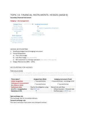 Summary notes covering all 6 topics in the final exam 1. Revenue 2. Employee Benefits 3. Intangible Assets 4. Corporate Social Responsibility 5. Financial Instruments - Shares, Futures, Options 6. Financial Instruments - Hedging