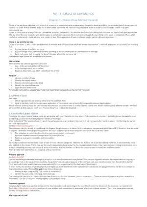 Complete set of notes from the entire semester, including lectures, case summaries and important parts from the textbook (Private International Law in Australia). I used these for the exam - set out with a table of contents so everything is easy to find. Topics covered: - Personal Jurisdiction - Grounds of Jurisdiction - Jurisdiction (Exceptions and Immunities) - Foreign Immovable - Foreign State Immunity - Diplomatic and Consular Immunity - Restraints on Proceedings - International Proceedings - Anti-suit Injunctions - Effect of Foreign and Interstate Judgements - Recognition and Enforcement of Judgments - International Arbitration - Choice of Law Method - Complications and Exceptions (Dépeçage/Incidental/Renvoi) - Proof of Foreign Law - Personal Connections - Constitutional Limits on Choice of Law - Statutes - Choice of Law for Obligations - Contracts - Torts - Choice of Law (Torts) - Choice of Law for Property - Transfer of Property between Living and Corporate Persons - Transfer of Immovable Property - Transfer of Moveable Property
