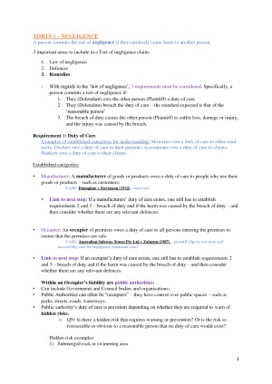Well organised, comprehensive and easy to follow notes divided into BOOKLETS containing each of the topics listed below. You'll need every single page to be prepared in the exam but, if you do as I did, upon seeing the questions you'll drop the booklets for irrelevant sections of law beneath your desk. Topics included: - TORTS 1 Negligence - TORTS 2 Other Torts & Remedies - CONTRACTS 2 - CONTRACTS 3 - AGENCY - INTELLECTUAL PROPERTY - COMPETITION AND CONSUMER LAW (I) - COMPETITION AND CONSUMER LAW (II) - BUSINESS STRUCTURES Notes are COLOUR CODED. - Orange for topic headings - Blue is background information/understanding to help you in your thinking & if you're stuck - Purple is what law you write in the exam (super easy and quick to follow under time pressure) - Black is other information, case law examples (bolded) and case law explanations (to help with understanding and thus application) With notes as easy to follow as these, you'll be able to manage the time pressure of the exam far more easily. Good luck!!