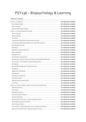 Covers All Material from Weeks 1 - 10. In-depth notes for each topic and refers to all theories for both "Bio-psychology Section" and the "Learning Section". Diagrams are included to assists the material that are provided and give a visual aid to all the notes. Notes are good to revises, missing information or simply starting from scratch as it covers all topics weeks 1 - 10.