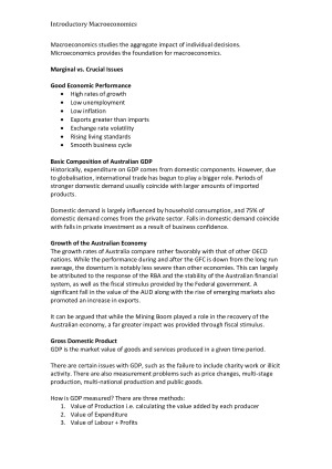 Full course summary notes, typed with full equations and diagrams along with great explanations of concepts, including the following topics: - GDP - Price level and inflation - National savings - Employment - Output gap - Keynesian model - Short run equilibrium - The multiplier - Fiscal policy - Monetary policy - Money, stocks and bonds - Setting interest rates - Aggregate demand and supply - Economic growth - Cobb-Douglas functions - Solow-Swan model - Exchange rates