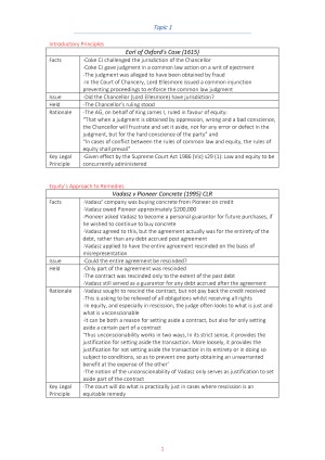 Exam notes created in Trimester 2 2018 for LAW5008 Principles of Equity Law (Monash JD). These summaries are designed to give a clear outline of critical facts, what was held, the rationale of the decision and the key legal principle established. They also note the court, legal citation, and the name of the judge(s) involved in the decision. These Notes Include: -Introduction to Equity -Fiduciary Duties and Relationships -Breach of Confidence -Personal Remedies -Proprietary Remedies -Assignment of Property Rights Note: For the best preview of the notes, view the 'preview' on a non-mobile device. Disclaimer: The accuracy of these notes is not guaranteed
