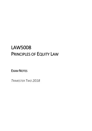 Exam notes created in Trimester 2 2018 for LAW5008 Principles of Equity Law (Monash JD). These notes are designed to act as a clear and concise checklist. They clearly go through through each step that must be considered in an exam, and are filled with clear authorities. These notes have been colour coded for ease of use. These Notes Include: -Introduction to Equity -Fiduciary Duties and Relationships -Breach of Confidence -Personal Remedies -Proprietary Remedies -Assignment of Property Rights Note: For the best preview of the notes, view the 'preview' on a non-mobile device. Disclaimer: The accuracy of these notes is not guaranteed