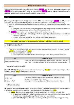 These LAW3402 notes were formulated for use in the Property Law B exam (which is open-book). The notes are detailed, with all of the relevant ideas and case examples for each topic. They were a useful reference in my exam, as they are constructed with answering problem questions in mind. Using these notes, I received a High Distinction. TOPICS COVERED: – Resulting trusts – Mortgages – Indefeasibility – Unregistered interests – Co-ownership The sample looks at how to approach an exceptions to indefeasibility question (specifically, fraud)