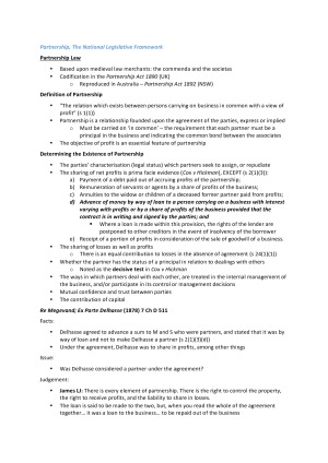 A complete set of summary notes for the subject Law of Business Organisations. Includes 12 weeks of content from the following topics: 1. Partnership, The National Legislative Framework 2. The Different Types of Business Entities 3. The Process of Incorporation 4. Corporate Personality and the Piercing of the Corporate Veil 5. Governing the Corporation 6. Binding the Corporation in Contract and the Directors Duty of Good Faith 7. The Duty of Care and the Business Judgement Rule 8. Insolvent Trading and Related Party Transactions 9. Shareholders’ Rights and Remedies 10. Insolvency and the Death of the Corporation