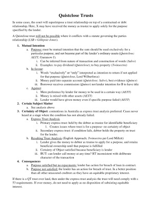 Using these notes, I achieved a HD in Trusts both on the exam and the overall unit. It sets out a step-by-step approach to each topic in the unit. TOPIC LIST - Trust Validity (Certainty of Intention, Alternatives to Trust, Certainty of Subject Matter, Certainty of Objects) - Charitable Purpose Trusts - Quistclose Trusts - Formalities - Constitution - Trustee's Duties (Management; Investment; Keep Accounts and Inform; Exercise Discretion; Defences and Limits on Liability) - Rights of the Trustee - Rights of the Beneficiary - Remedies