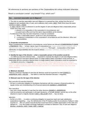 placed 2nd in the unit; all templates; basically, once you identify the issue, you just turn to the correct template and fill the blanks left. wk6: securities markets wk7: Directors’ Duties – Best Interests; Proper Purpose wk8: Directors’ Duties – Conflict of Interest; Care and Diligence wk9: Directors’ Duties: Consequences of Breaches of Duty wk10: Companies’ legal rights against others wk11: Members’ Rights and Remedies wk12: insolvency
