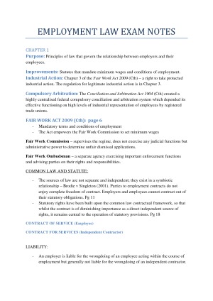 Exam notes covering topics: Types of Employment Labour Hire Contract Formation Duties Employers Implied Duties Employees Implied Duties Workplace Safety Notice & Termination Unfair Dismissal Unlawful Termination Discrimination Modern Awards Enterprise Agreements