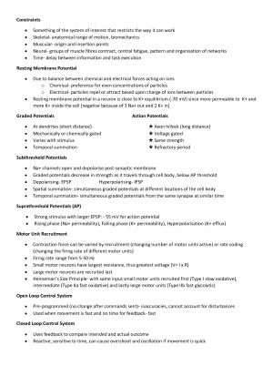 Very useful for final exam. These topics are covered briefly: 1. Constraints 2. Sensory contributions to movement control- muscle receptors (afferents) 3. Vestibular system 4. Sensor-Motor Integration- Spinal reflexes 5. The Visual System and Motor Control 6. Balance and Posture ____________________________ These topics are covered in more detail as the final exam has a greater focus on them: 7. Control of Rhythmic Movement- CPGs 8. Voluntary Movement- Overview 9. Cortical Control of Movement- M1 10. Cortical Control of Movement- Secondary motor areas 11. Basal Ganglia and Movement Control 12. The Cerebellum 13. Introduction to Learning and Memory 14. Cellular Basis of Motor Learning 15. Approaching Motor Learning in Practical Contexts 16. Structure of Practice 17. Generalisation and Transfer 18. Augmented Feedback