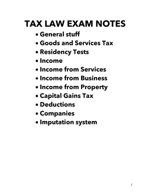 These are the notes I used to get a H1 on Tax Law 1. It gives a step-by-step approach to crafting the perfect answer, such that you'll be easing through the exam rather than frantically flipping the pages. Contents: 1. General stuff - frequent cases/statutes 2. Goods and Services Tax 3. Residency Tests 4. Income 5. Income from Services 6. Income from Business 7. Income from Property 8. Capital Gains Tax 9. Deductions 10. Companies 11. Imputation system