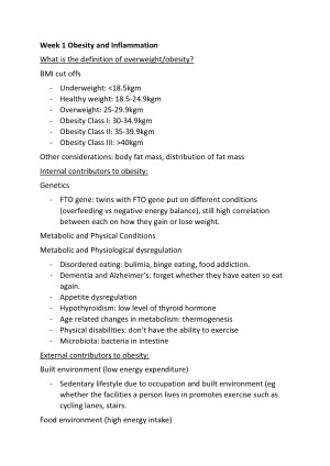 Content from weeks 1-10, summarised to include the most important and relevant information needed for exams. Includes information from lectures and seminars, helping me to get an 86HD in the subject. Topics: - Obesity and Inflammation - Management of Obesity - Cardiovascular disease - Diabetes pathophysiology - Diabetes management - Nutrition and cancer - Coeliac disease and IBS - Adverse reactions to foods - Diet and mental health - Hypertension - Epigenetics and nutrigenomics