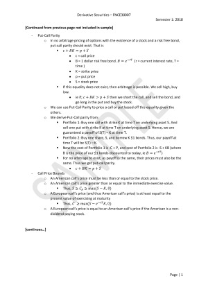 Concise dot point notes with formulas of all topics covered. Excellent as exam revision as well as general notes to assist with semester learning. Topics covered: - Derivatives - Arbitrage - Interest rates - Option trading - Binomial option pricing - Multi-period binomial option pricing - Monte-Carlo valuation - Black-Scholes-Merton valuation - The Greeks and implied volatility - Forwards and futures - Risk management