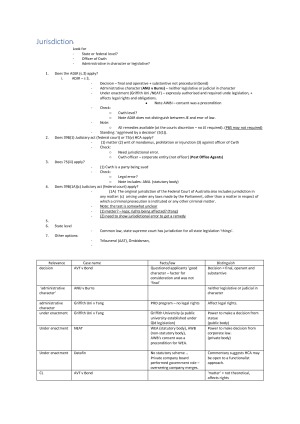 Hey everyone, Here is a list of the cases, why they matter, and the basic facts and law that make them relevant - everything I took into the exam. Topics: Jurisdiction, Standing, Procedural Fairness, Exclusion of Procedural Fairness, Error of Fact (Type 1 & 2), Unreasonableness, Unauthorised Actions, Policy, Jurisdictional Error, Privative Clauses. These are notes from tutorials, lectures, external reading etc. Note: these are not case summaries. (I provide case summaries separately).