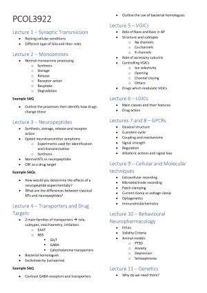 These are a set of exam style questions written by myself for PCOL3022 and PCOL3922. These questions are extremely high-yield and cover all areas of the course. Since the PCOL final is long answer, this style of revision will help you tremendously! I used these questions to prepare and received an overall mark of 87 and my friend who also used these received a mark of 91. I majored in Advanced Pharmacology and graduated with an HD WAM across all Senior Pharmacology units. I attribute these marks to the style of studying I used with these notes.