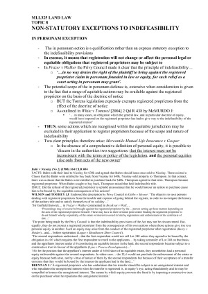 These concise, thorough and complete notes for MLL325 include complete summary of: prescribed textbook; case summaries; relevant legislation. Covering all topics in the unit, these materials could essentially be used as a replacement to the prescribed textbook, while being more concise, easy to read, and less time consuming. These notes will be a fantastic supplement to your studies, and a vital resource come exam time. TOPICS COVERED: TOPIC 1: INTRODUCTION TO LAND LAW TOPIC 2: CONCURRENT INTERESTS IN LAND (CO-OWNERSHIP) TOPIC 3: SEVERANCE OF JOINT TENANCY TOPIC 4: PRIORITIES IN GENERAL LAW LAND TOPIC 5: BACKGROUND AND HISTORY OF TORRENS SYSTEM TOPIC 6: INDEFASIBILITY IN THE TORRENS SYSTEM TOPIC 7: STATUTORY EXCEPTIONS TO INDEFEASIBILITY TOPIC 8: NON-STATUTORY EXCEPTIONS TO INDEFEASIBILITY TOPIC 9: DISPUTES INVOLVING UNREGISTERED INTERESTS TOPIC 10: PARAMOUNT INTERESTS TOPIC 11: THE ASSURANCE FUND