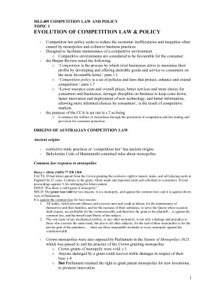 By using these MLL409 notes, I achieved a score of 70 in the exam! These concise, thorough and complete notes for MLL409 include complete summary of: prescribed textbook; case summaries; relevant legislation. Covering all topics in the unit, these materials could essentially be used as a replacement to the prescribed textbook, while being more concise, easy to read, and less time consuming. These MLL409 notes will be a fantastic supplement to your studies, and a vital resource come exam time. These are a complete summary of the MLL409 lectures, textbook, cases, legislation and topic guides. A COMPLETE SET OF MLL409 NOTES. TOPICS COVERED: TOPIC 1: EVOLUTION OF COMPETITION LAW & POLICY TOPIC 2: RESTRAINT OF TRADE TOPIC 3: OUTLINE OF AUSTRALIAN COMPETITION LAW TOPIC 4: GOALS OF COMPETITION LAW TOPIC 5: INTRODUCTION TO COMPETITION LAW ECONOMICS TOPIC 6: CARTEL CONDUCT TOPIC 7: ANTI-COMPETITIVE AGREEMENTS AND PRICE SIGNALLING TOPIC 8: EXCLUSIONARY PROVISIONS (PRIMARY BOYCOTTS) TOPIC 9: MISUSE OF MARKET POWER TOPIC 10: EXCLUSIVE DEALING TOPIC 11: RESALE PRICE MAINTAINANCE TOPIC 12: MERGERS TOPIC 13: AUTHORISATION, REMEDIES AND PROCEDURE TOPIC 14: ACCESS
