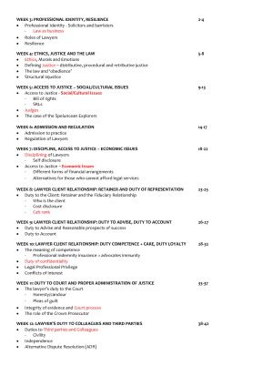 Summarised, structured exam notes All readings, cases, legislation included - colourcoded Useful for seminar participation All topics included: - Professional identity, resilience - Ethics, Justice, Law - Access to justice - social/cultural issues, economic issues - Admission and regulation - Discipline - Lawyer/client relationship - retainer, representation, duty to advise, duty to account, competence and care - Duty to court - Duty to colleagues