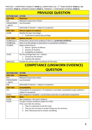 These notes are 7 pages of pure spoon feeding. It covers the following: 1. Privilege; 2. Competence (Unsworn evidence); 3. Competence (s18 - spousal immunity); 4. 1st Hand Hearsay w/exceptions (criminal); 5. The 10 MARKER s60 pathway (Relevance > Compellability > Declaring unfavourable > Prior Inconsistent Statements 'PIS' > Dual Purpose Provisions > Admission via the credibility rule > s60 purpose 'admission via the hearsay rule' > admission exception > Discretionary Rules > EA warnings > Admission under s56) 6. Opinion Evidence; 7. Tendancy Evidence; and Coincidence Evidence. The style of these notes is step-by-step based and has the relevant applicable section and/or case on the left-hand side. Enjoy :) Disclaimer: These notes are not going to help you if you have no understanding about this subject or you are just buying these notes because you cannot be bothered.