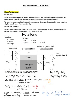 Distinction CVEN3202 Soil mechanics Notes Includes notes from lectures and worked examples Topics include: Phase relationships, Soil classification, Clay minerals, Compaction, Stress and Mohr Circle, Stresses in soils, One Dimensional Seepage, Stresses induced by flow, Two Dimensional Seepage, One Dimensional Settlement, Rate of Settlement, Shear strength of soils, Triaxial test, Pore water parameters, Slope stability
