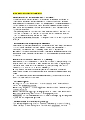 This covers the HPS308 Learning Objectives from weeks 1-11 that are examinable. This is my bible for this subject. Topic 1: Classification, diagnosis and an integrative approach to psychopathology Topic 2: Anxiety disorders, Trauma and Stressor-Related, and Obsessive-Compulsive and Related Disorders Topic 3: Mood disorders and suicide Topic 4: Somatic symptom and dissociative disorders Topic 5: Eating disorders Topic 6: Substance-related and addictive disorders Topic 7: Schizophrenia & other psychotic disorders Topic 8: Neurodevelopmental disorders Topic 9: Personality disorders Topic 10: Mental health services: legal, ethical, and professional issues Topic 11: Cross-cultural approaches to psychopathology