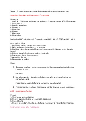 the notes included major topics throughout the semester for reviewing, there are 13 topics listed: topic 1 Australian Securities and Investments Commission topic 2 Business Structures one topic 3 Business Structures two topic 4 Legal nature of company topic 5 Internal governance and corporate liability topic 6 Promoters, corporate fund raising, debentures, receivership topic 7 Member meetings topic 8 Directors duties part 1 (fiduciary duties) topic 9 Directors’ duties : duty of care, skill and diligence topic 10 Shareholder’s remedies topic 11 External Administration and Alternatives to liquidation topic 12 External Administration- liquidation/winding up