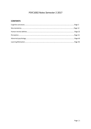 These concise notes are written in dot point form and contain all the key information covered in lectures and tutorials. Studying from these notes definitely helped in achieving an HD for the unit! The topics included are as follows: -Cognitive processes -Neuroanatomy -Human mental abilities -Perception -Abnormal psychology -Learning Motivation