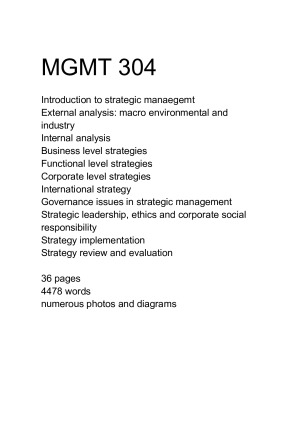 Full Lecture notes of MGMT 304. Introduction to strategic manaegemt External analysis: macro environmental and industry Internal analysis Business level strategies Functional level strategies Corporate level strategies International strategy Governance issues in strategic management Strategic leadership, ethics and corporate social responsibility Strategy implementation Strategy review and evaluation 36 pages 4478 words numerous photos and diagrams
