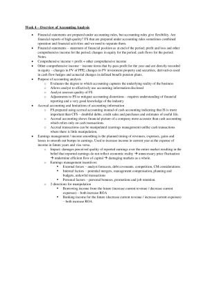 Summary of various textbooks and lecture slides. Use these bad boys and you won't have to buy the book or even look at the slides. Note: I've excluded the last 2 weeks of content - (Valuation theory; and cost of capital). The reasons being that (1) It's highly practical and numerical based (therefore no notes needed); (2) it's pretty basic (just fundamentals of corporate finance). TOPICS: Capital Market Analysis Business Analysis: Macro, business strategy and industry analysis Overview of Accounting Analysis Financial Analysis Forecasting Result: 91