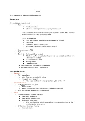 Comprehensive notes made from lectures, tutorials, readings and my own research detailing the second half of the course. Topics include: - Terms - Construction - Privity - Discharge by Performance - Discharge by Agreement - Breach - Repudiation - Frustration - Termination