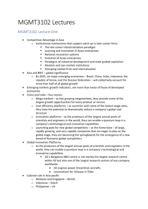 Detailed notes covering the whole course. Contents: - Globalisation, nation states and competitiveness in East Asia - The LLL and other model of industrial developmnet - Lessons from late movers - emerging economies and internalisation strategy - Industrial policy and institutions in East Asia - Global Value Chain and role of FDI in competitiveness - Industrial policy, Keiretsus and Chaebols: Japan and Korea - The role of innovation - Institutional voids and strategy of emerging market firms - Instituions and systems of innovations