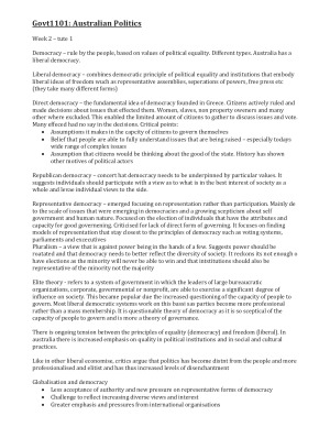 GOVT1101 USYD FULL SEMESTER LECTURE AND READING NOTES FROM HD STUDENT. Week 2 Ways of thinking about power in Australia. Week 3 Is Australia a liberal democracy? Week 4 What's voting got to do with democracy? Week 5 What if a politician invited everyone to a party and nobody went? Exploring Australia's party system. Week 6 Making (vegan) sausages? What really goes on in Australian parliaments? Week 7 From ideas to action: the role of the Executive (ministers, bureaucrats, advisers and bureaucrats). Week 8 Men and women wearing bad wigs: the High Court and the Constitution. Week 9 Unnecessary waste, blame games and duplication? Federalism and Australian democracy. Week 10 Democracy as persuasion: media old and new, spin doctors and the public relations state. Week 11 Democracy as participation: individual political action, pressure groups and social movements. Week 12 Do Australian democratic processes matter at all? Democracy and international power.