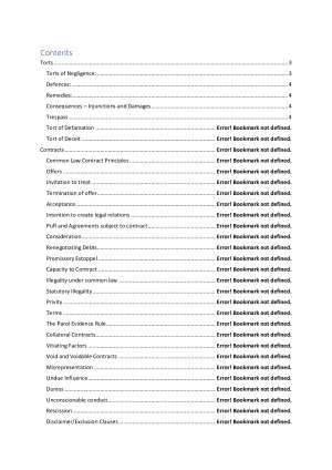 Final exam is open book, these set of notes is all you need to bring to the final exam. Topics included: Torts Contract Law Agency Law Consumer Law Competition Law Business Structures Law