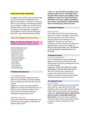 These notes provide an easy to follow scaffold of how to answer a torts problem question. Topics include trespass, negligence, various defences, and compensation. They also involve brief case summaries and statutory provisions.