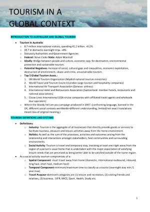 These easy to understand Tourism in a Global Context notes cover the entire semester's topics and notes on all guest speakers. Topics Covered: -Introduction to Australian and Global Tourism -Tourism Definitions and Systems -A History of Tourism -Tourism Destinations -The Tourism Product/Tourism Industry -The Tourist -Tourism Marketing and Promotion -Sustainable Tourism and the Economic Environment of Tourism -Tourisms Social and Environmental Interactions -Tourism in our own Backyard -Guest Speaker Notes