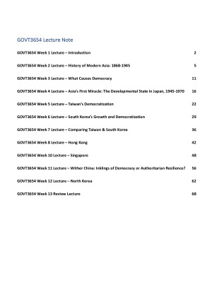 What are included: - All lecture notes for GOVT3654 (Week 1-8, 10-13) - Extra infomation that Minglu said in the lectures but is not written in the powerpoint Why should you buy this: - I attended all lectures and listened to all lecture recording again when I went back home - This note is very easy to understand and is well-organized - IF YOU SKIP A LOT OF LECTURES AND DO NOT UNDERSTAND THE PPT SLIDES, BUY THIS
