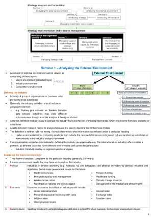 Concise notes covering all topics in Semester 2, 2018. It includes all information from the podcast and notes from the textbook + reading kit. Topics: 1 Analysing the external environment 2 Analysing the internal environment 3 Developing strategy 4 Measuring performance 5 Managing shareholder value creation 6 Managing customer value and relationships 7 Managing supplier relationships and strategic outsourcing 8 Managing human capital as a strategic resource 9 Managing environment and engaging in corporate social responsibility 10 Managing strategic risks 11 Management controls