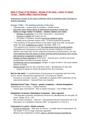 Notes cover the entire subject; lectures, tutorials & all set readings from Semester 2, 2017. The reading summaries provide a simple overview, argument and critique of each reading which is covered in the final exam. Summaries each topic area with definitions of key terms to provide a succinct outline of key points. Logically set out with colour coded headings making it convenient to zero in on specifics or scan through the pages for an overall impression of the course. Topic List: - Introduction - Issues, Concepts & Approaches - Four Major Dimensions of Globalisation - Economic & Political Globalisation - Power to the Market, The State and Globalisation & Global Development - Cultural Globalisation - Cultural Diversity, divides, global culture & global civil society - Political and Military Globalisation - Military Security and the state, the global commons (climate change + environmental degradation) - Conclusion - global governance for a global era?