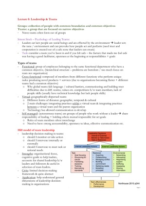 Notes cover the entire subject; lectures, tutorials & readings. Set out under weekly topics providing a succinct outline of key points. Logically set out with use of diagrams making it convenient to zero in on specifics or scan through the pages for an overall impression of the course. The layout is especially useful in the open book exam because you can quickly find specific topics and use the exercises as examples. In addition, the final page of diagrams is good to have in front of you throughout the exam as a general overview of the course structure. Topic List: - Self-Leadership - Classical Approaches to Leadership - Contemporary Approaches to Leadership - Leadership and Communication - Leadership, Mindfulness & Resilience - Leadership and Teams - Leadership and Complex Problems - Leadership, Decision-making and Ethics - Leadership and Diversity