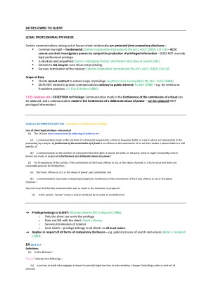 Comprehensive notes on Legal Ethics - comprised from lectures/slides, textbook and reading materials. Topics Include - Introduction to Ethics Admission to Practice Duties Owed to Clients Costs and Duty to Account Duty owed to Administration of Justice Duties owed to the Profession and Other Responsibilities Complaints and Discipline Very useful in exam - summarised and cut down for easy guided use!