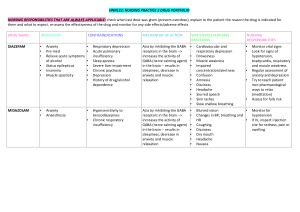 Portfolio includes: indication, contraindications, mechanism of action, side effects and nursing responsibilities for the following drugs: - diazepam - midazolam - atracurium - propofol - diclofenac - docusate - artificial tears - morphine - ondansetron - salbutamol - heparin - paracetamol - metoclopramide - insulin - perindopril - atorvastatin - potassium - magnesium - ceftriaxone - ibuprofen - oxycodone